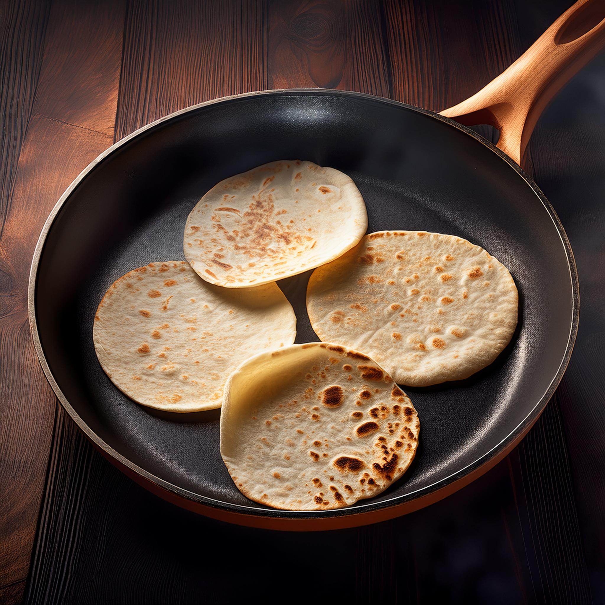 - 구워내기: 중간 불로 달군 팬(또는 그릴)에 또띠아를 올립니다. 또띠아를 한 면당 약 1~2분씩 굽습니다. 또띠아가 살짝 부풀고 갈색 반점이 생기면 뒤집어 다른 면도 동일하게 구워줍니다.